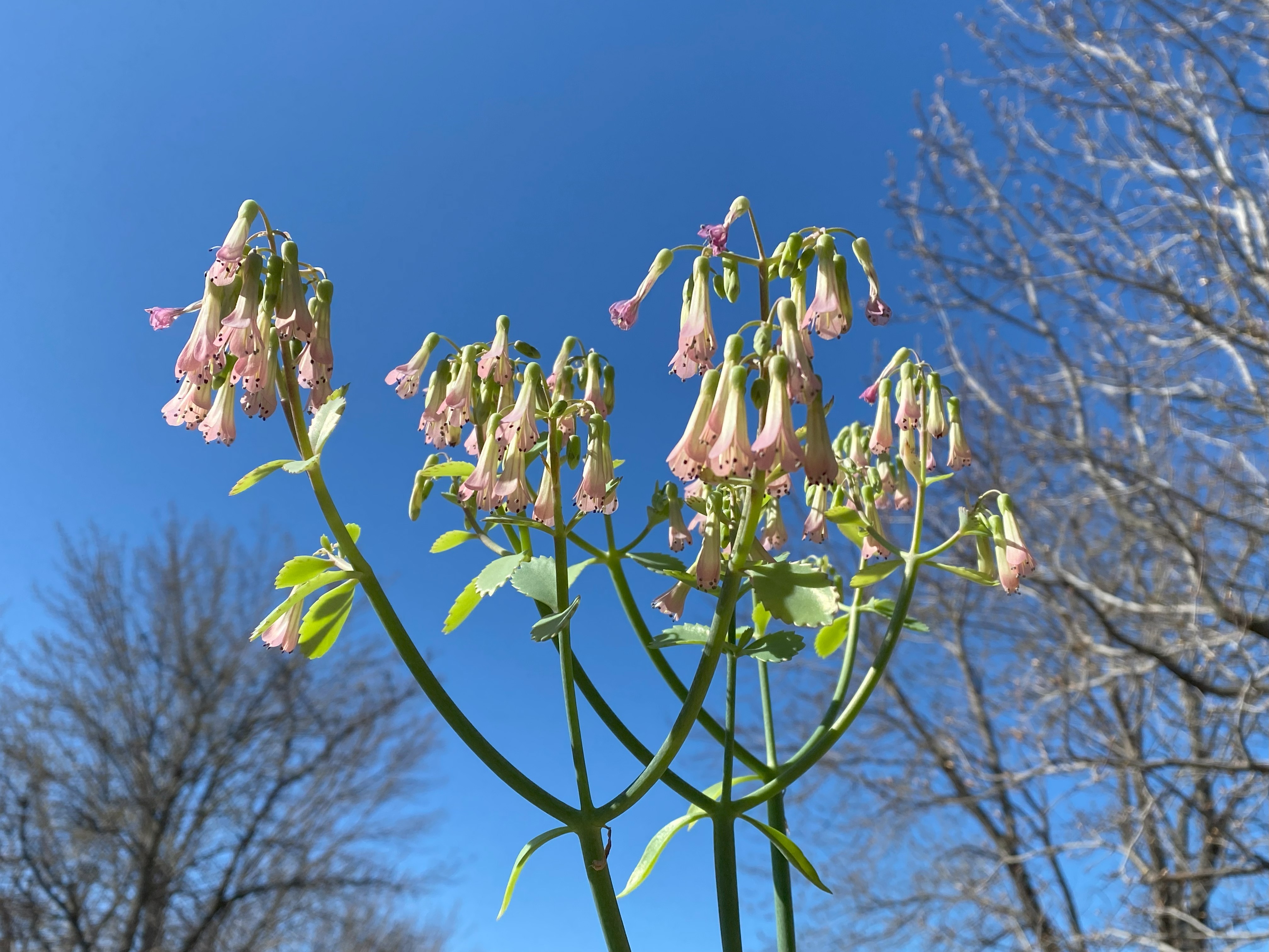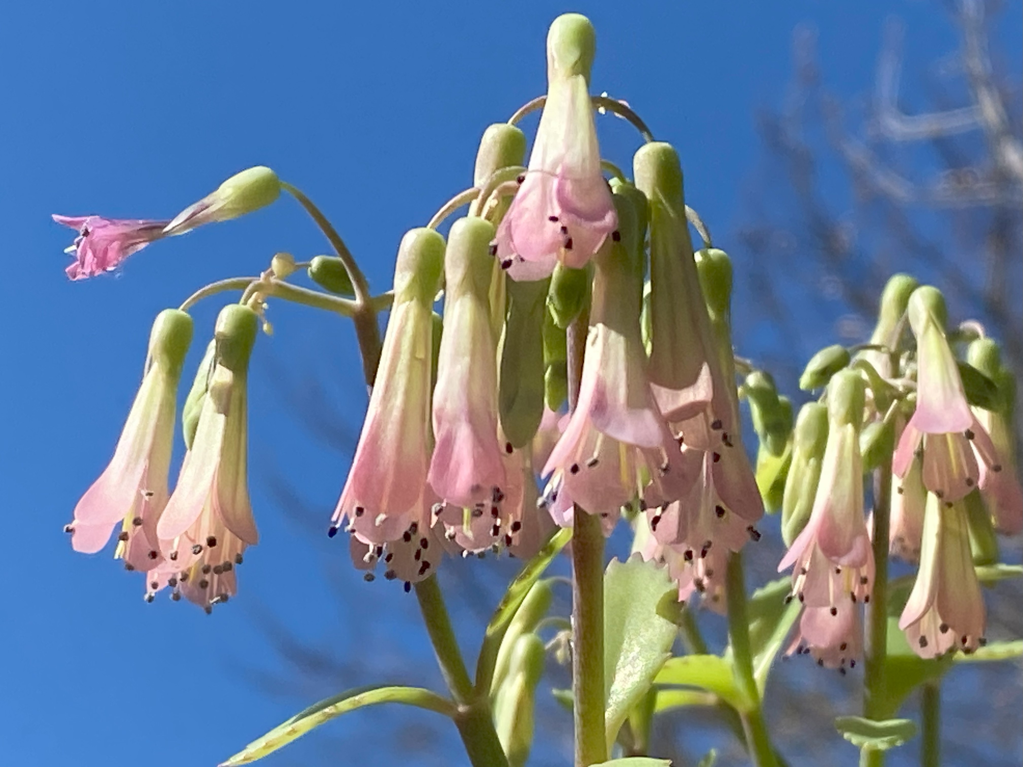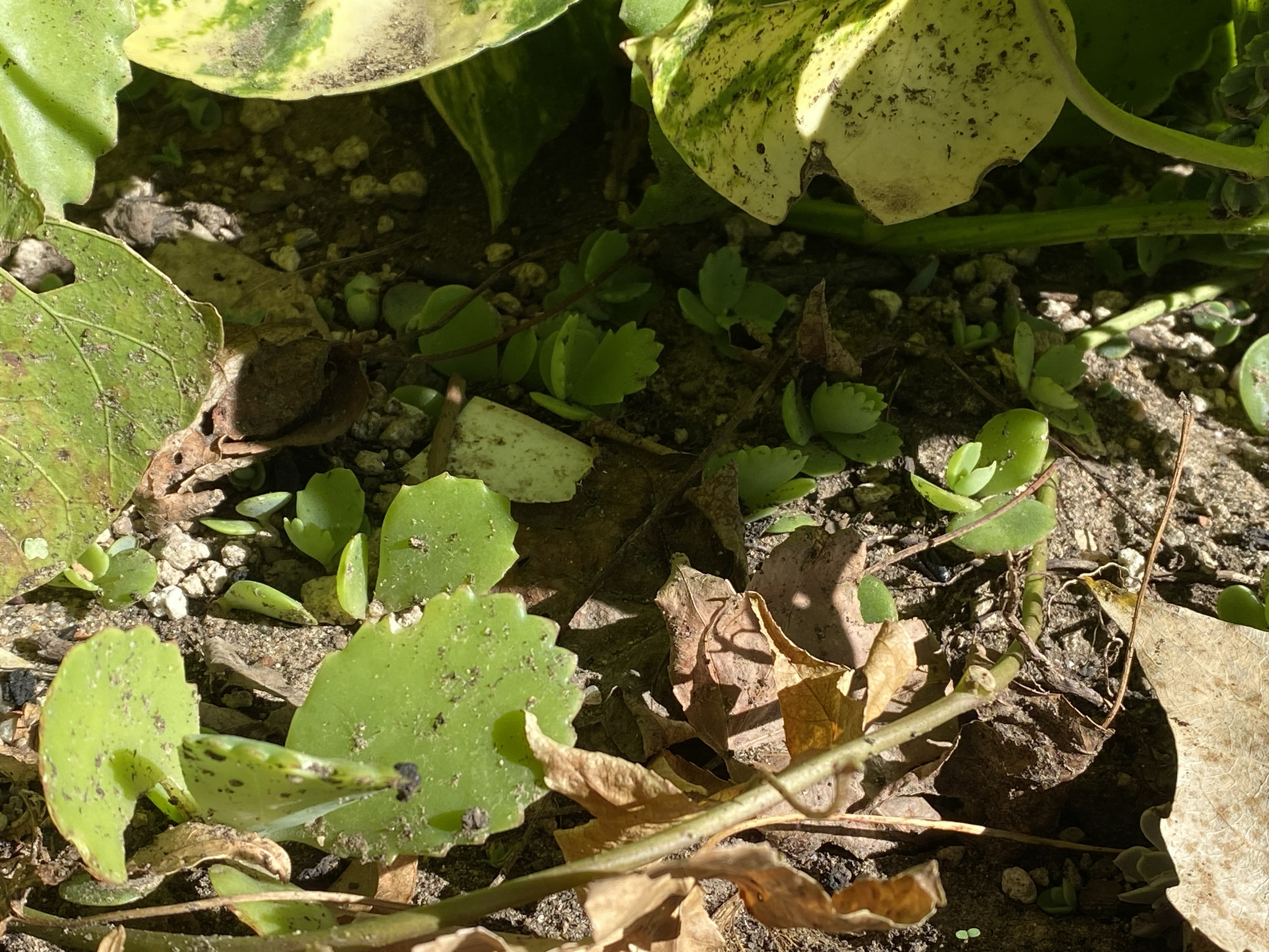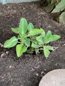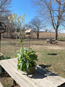 Take this fascinating succulent, for example. My daughter who lives 500 miles distant once gave me this “Mother of Thousands.” It grows fast and drops lots of miniscule offspring. On its large leaf pads, tiny clones pop up in each of the serrations around the edge. They fall and take root and propagate. The mother plant grows to be huge during the months it’s planted in the flower beds outside and I have had to cut it back to bring it inside for the winter. That seems to prompt a flower spike, which boasts unique blossoms. Once the petals have wilted, the stem itself produces tiny succulent shoots. I think of my daughter every time I see the plant and I have to wonder what she was trying to tell me by passing along a plant named “Mother of Thousands.” It is surely living up to its name.