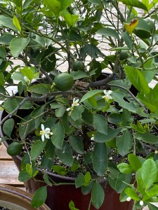 When Barry moved from Elk Falls to my hometown (slightly bigger with more conveniences available) he brought a small lemon tree in a container, his only house plant. He named the tree Jose Limon. I think it reminded him of happy times in southern California. Jose has to be brought inside during the cold winter months in the Great Plains region, so it stays in a pot. The tree grew and grew, though, and is now in the biggest pot I could find.