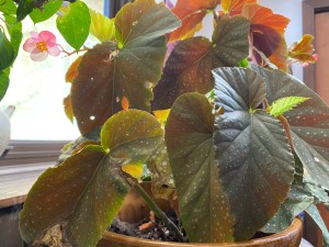 And so the angelwing begonia is esteemed in my collection. It represents the family’s values—among which are resilience, persistence, continuity, and devotion. It is determined and dedicated, regardless of its human caretakers, and just keeps on keepin’ on, fulfilling the purpose the universe has assigned to it.