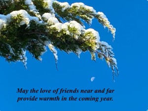 As I passed the pines, Sara ran up behind me and bounced a limb. Snow sprayed in every direction, showering my face with needles of ice. I brushed the snow from my coat and chased her onto the residential street. We proceeded from house to house, sending joyous strains of familiar Christmas carols into the night air and wishing all a Merry Christmas.
