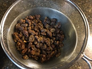Measure a cup of raisin into a saucepan. Cover them with water and simmer them gently while you prepare the rest of the cookie dough.