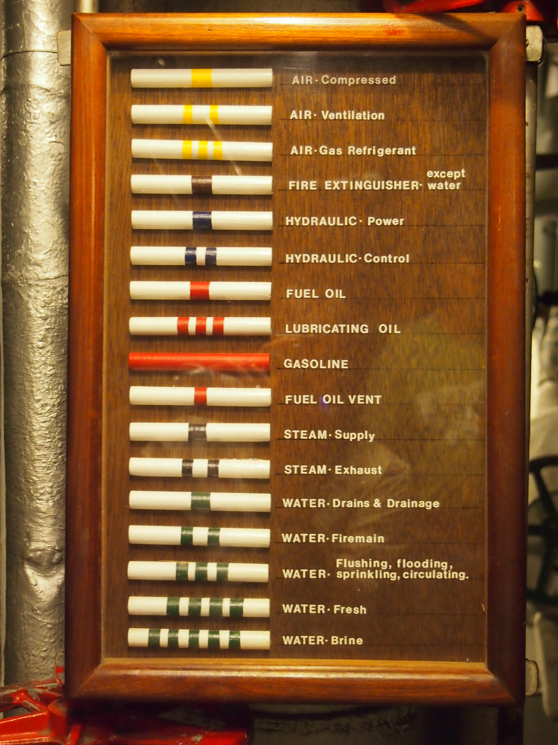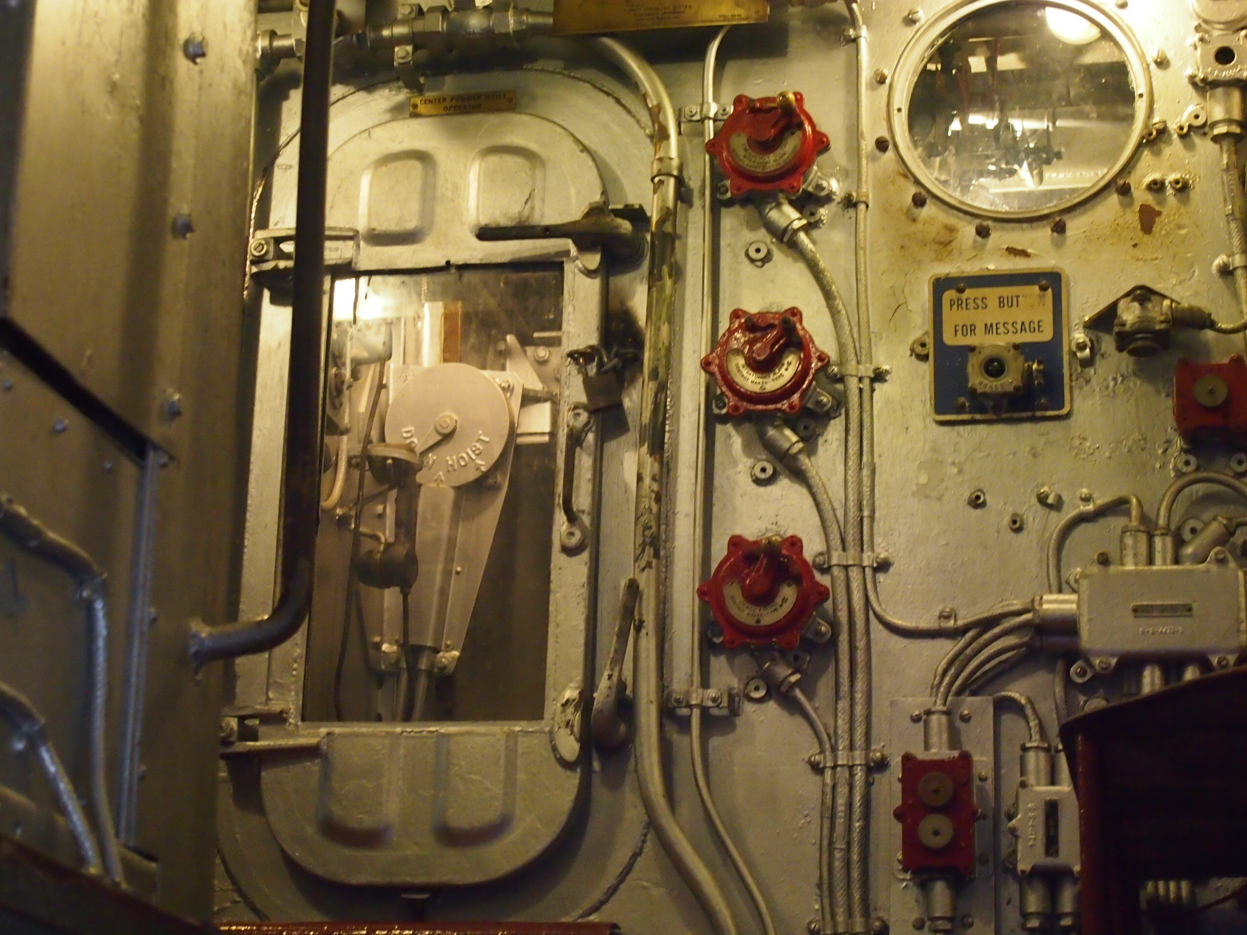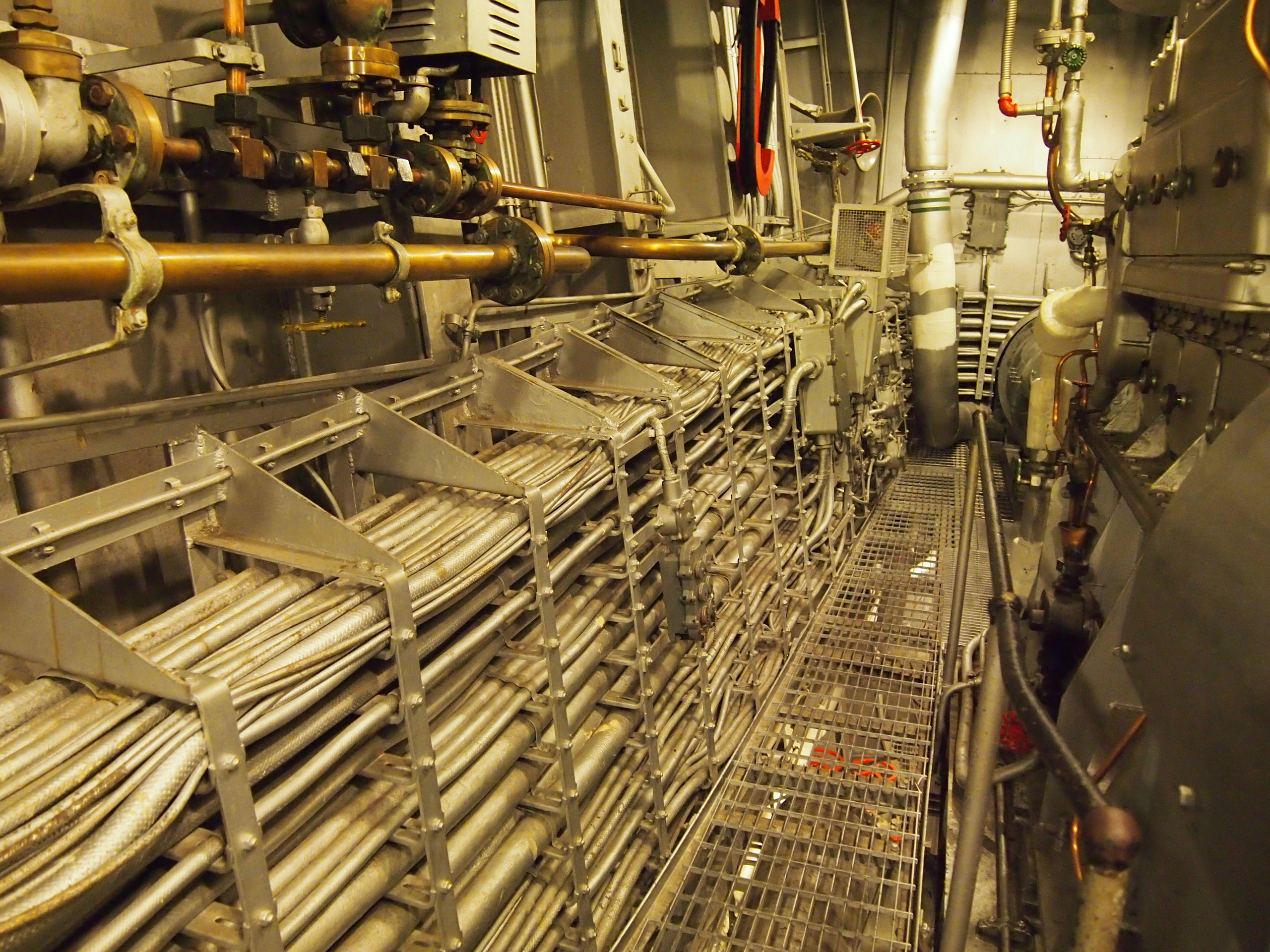 “There are two firerooms (boiler rooms) and two enginerooms divided from forward aft into fireroom, engineroom, fireroom, and engineroom in that order. The forward engineroom drives the starboard shaft and propellor, and the after engineroom drives the port shaft and propellor. Each fireroom has two high pressure boilers, numbered in order, 1 and 2 forward, 3 and 4 aft. If it is desired, boilers 1 and 2 may be used to drive the after boilers and similarly, boilers 3 and 4 can be used to drive the forward engine. Under wartime conditions we use both engines with one forward and one after boiler.