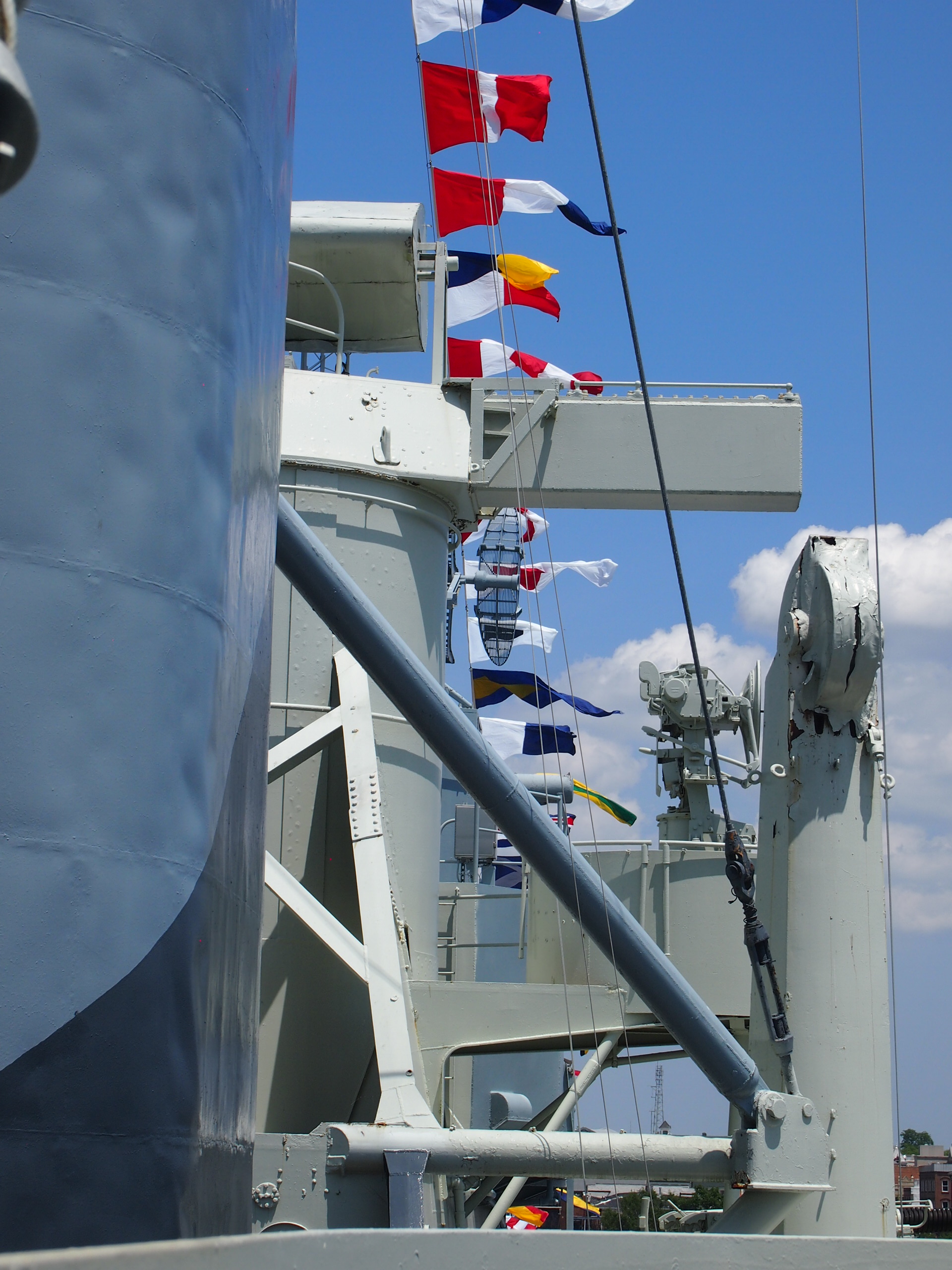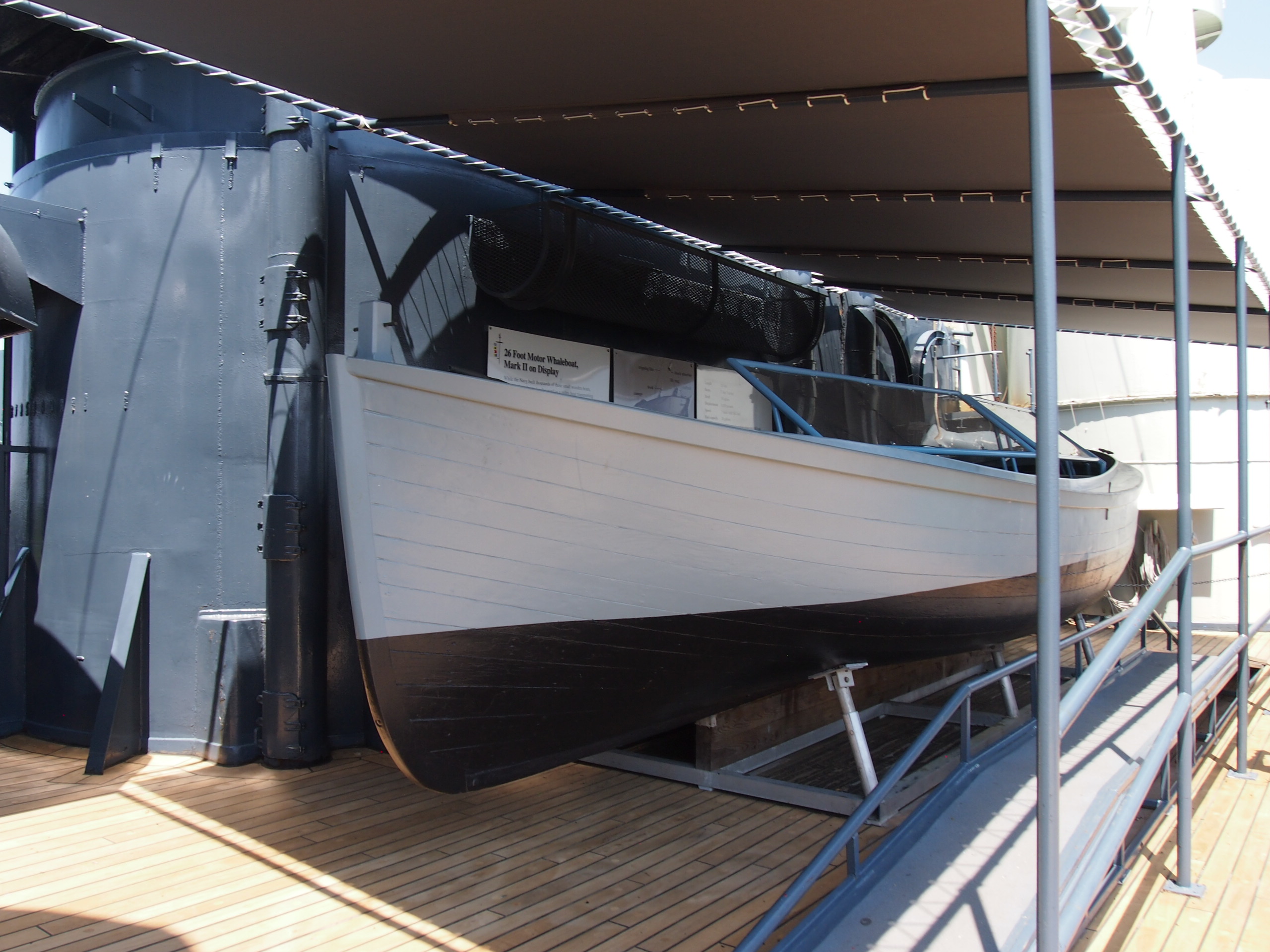 “The ship will be driven by twin screws, turbine driven. The rudder is of the balanced type on a streamline form, carried entirely on the rudder stock. There are two bower anchors, one port and one starboard–each weighing nearly 3000 pounds and each bent to 109 fathoms of 1 1/8” steel die locked chain.OLYMPUS DIGITAL CAMERA On each side is carried one 26′ Diesel powered motor whaleboat with a capacity of 24 men each. There are also 8 balsa wood floats, capacity 25 men each.